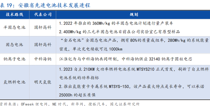 技术创新方面:安徽省的电池技术发展呈现出多元化趋势,涵盖了半固态、固态、钠离子以及氢燃料等多种技术路线,各代表公司在各自领域均取得了突破性进展,为推动能源转型和新能源汽车产业发展提供了强有力的技术支撑。其中,国轩高科已于2022年推出了能量密度为360Wh/kg的半固态电池,并计划实现量产装车;在钠电池方面,由江淮钇为与中科海钠共同研制的钠电池已经成功上车江淮钇为钠电版“花仙子”,并已成为全球首款钠电池量产车;燃料电池方面:明天氢能成功首发了210KW大功率燃料电池系统MTSYS210,刷新了国内自主燃料电池系统的功率纪录。