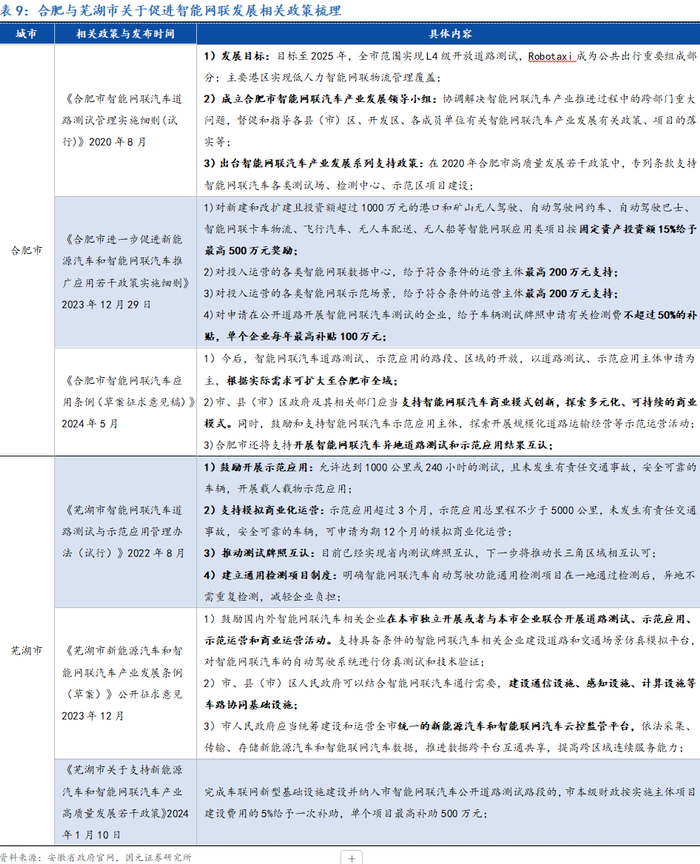 在省级政策层面,安徽省已将新能源汽车和智能网联汽车产业作为重点发展的十大新兴产业之一,并于近年来出台了一系列政策方案,如《新能源汽车和智能网联汽车产业“双招双引”实施方案》和《安徽省“十四五”汽车产业高质量发展规划》,明确提出到2025年实现智能汽车市场化应用和智能基础设施建设目标,同时明确了“十四五”期间,以合肥、芜湖新能源汽车重大新兴产业基地为全省汽车产业核心发展区,加快芜湖汽车产业国际化步伐。在市级政策层面,目前合肥市与芜湖市已于近年来连续出台多个针对智能网联汽车推广的规范及征求意见稿,具体政策涵盖出台多种促进产业发展的资金支持与奖励、鼓励开展示范应用,支持模拟商业化运营,推动测试牌照互认,建立通用检测项目制度等。
