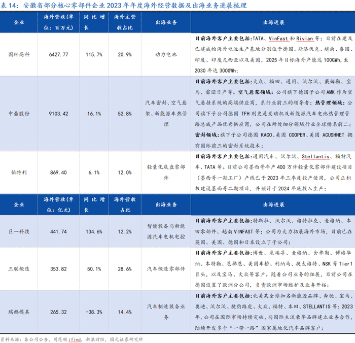 安徽省的新能源汽车产业链正随着中国汽车业的国际化浪潮高歌猛进。根据梳理,目前安徽省新能源汽车企业共在海外设立47家子公司,覆盖美国、澳大利亚、南非、日本、德国等20个国家及地区。其中有代表性的零部件企业包括国轩高科、中鼎股份、伯特利、巨一科技、三联锻造、瑞鹄模具等: