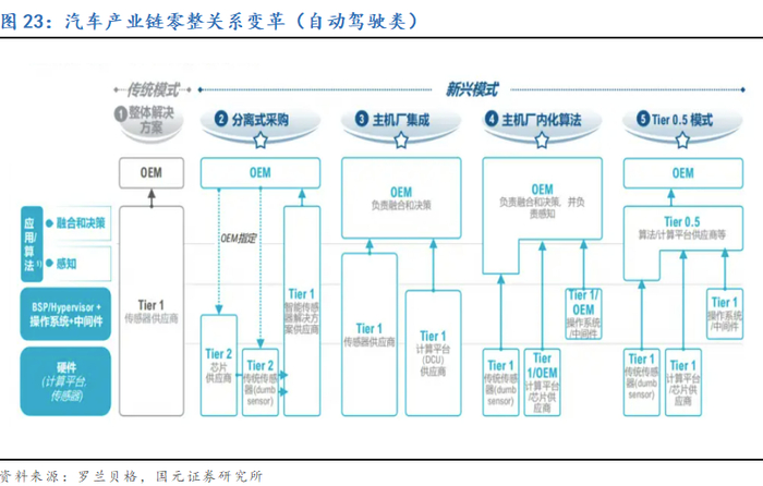 产业链由线性链式结构向网络结构转变,核心平台和关键零部件共同发挥作用。汽车产业的传统产业链模式是围绕整车展开的线性链式结构。整车厂向TIER1厂商订货,TIER1再向TIER2寻求供应,TIER2的更小的零部件由TIER3供给,层层递进,链式供应,整车厂较少与上游节点供应商直接对话。但随着智能电动化的发展,以及疫情、俄乌冲突与“缺芯”等问题导致的全球供应链体系受挫;当下,汽车产业链格局正在加速转型之中。首先是电动智能技术带动汽车产品技术复杂度上升,革新速度加快。过去主要由零部件商创新,整车厂集成的创新传导方式,转变为整车厂根据市场前端需求定义产品和主要零部件,然后与TIER1、TIER2、TIER3等共同开发新产品的发展模式,上游创新性强,重要等级高的零部件商直接成本主机厂主动寻求合作的对象,不仅产生生态的信息传导模式变更,不同环节企业的议价权也有明显变化。其次,疫情、局部战争、贸易摩擦等外生不确定性冲击下,关键重要零部件的自主可控已经成为大量整车和TIER1企业必须关注的话题。对相关产业链节点的直接对话与生态整合,也在成为主机厂商和TIER1厂商的重要工作。再次,在行业复杂度增加,创新型软硬件不断换代革新,通用零部件寻求轻量化和降本的大背景下,具备高度整合能力,与综合解决方案提供能力的TIER0.5型供应商出现,并逐步形成对产业更强的话语权,开启引导整车厂发展的道路。而具有较强实力的整车厂则开启垂直整合之路,不仅自研或者产业内部化主要TIER1,也对上游关键部件如芯片、算法中心等开启自研与内部化整合之路。汽车全产业链不同节点和经营主体间的关系日益复杂化,而产业链生态则向具有整合平台作用的链主与关键重要零部件链主共同主导的模式发展。面向未来的产业布局与招商,必须对包括整车、TIER1大平台以及包含瞪羚企业、独角兽企业在内的专精特新“小巨人”等不同类型的链主给予足够重视。