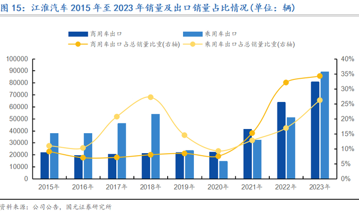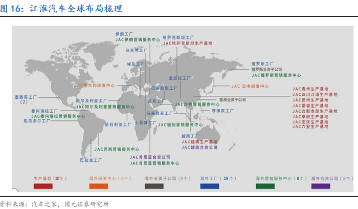 高速发展阶段(2013年至今):自2013年“一带一路”倡议提出以来,江淮汽车积极响应,加速了海外市场的扩张步伐。2014年,江淮汽车开始布局哈萨克斯坦等区域国家市场,2015年公司与哈萨克斯坦SAP公司签署KD组装协议,并在同年收获了首批318辆乘用车订单。江淮汽车在哈萨克斯坦科斯塔奈项目的成功,不仅提升了品牌在当地的影响力,也为中国汽车品牌在海外市场的深耕提供了模板。此外,江淮汽车还涉足了阿联酋、越南、沙特阿拉伯、乌拉圭等“一带一路”共建国家,实现了对100多个国家的市场覆盖。2017年,江淮汽车正式进入南非市场,并在5年时间内布局70家营销网点,实现终端销量的大幅增长。截至2023年末,江淮汽车已累计出口至全球132个国家和地区,累计出口量近140万辆。展望未来,作为“一带一路”的“标杆企业”,江淮汽车也将完善产品布局、加大海外市场拓展力度,进一步扩大中国自主汽车品牌在全球汽车市场的影响力。
