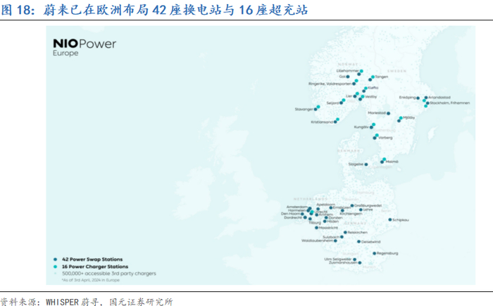 配套基础设施建设方面:为进一步提升欧洲用户的出行体验,蔚来也在积极扩充其欧洲换电站网络。截至目前,蔚来已在欧洲部署了42座换电站,为欧洲用户提供便捷的补能服务。此外,根据蔚来汽车创始人李斌的表述,蔚来计划加快海外换电站的建设,并计划在重要的交通路线上建立换电站,例如从上海到阿姆斯特丹的路线,沿途预计需要大约60个换电站。