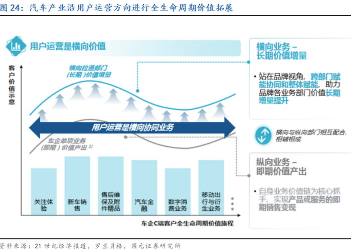 汽车产业链价值重心后移,并与低碳城市、智慧城市相结合,形成广义后市场机会。展望更长远的电动智能汽车产业,可以预见两种趋势:一是,随着电动智能车渗透提升,产品的稳定性逐渐进入稳定期,车端、零部件端的创新会逐渐变慢,并在激烈竞争之下呈现产品整体趋同,超额利润缩减的现象。高利润的环节后移至更具有差异化特征,能够给消费者提供个性化价值的二手车、改装、定制化软件以及定制化产品、多元化出行租赁,以及丰富的汽车金融方案等广义后市场环节。汽车产业价值环节围绕用户运营向用户全生命周期价值方向拓展。二是,面向更长远的未来,随着自动驾驶的普及,在取消了驾驶舱后,车辆将成为带有储能功能的多元化城市智慧移动空间。其背后在能源端是智慧能源体系,链接充电、换电、储能等电力单元功能,在智慧城市端,则是城市移动空间综合体,是智慧城市“车路云网”的超级空间和超级终端。智慧移动空间可以在运营主体的大数据系统安排下按照出行用户需要提供会议车、电竞车、影院车、亲子车等多种移动空间模式,同时也是城市巡逻车、配送车、移动超市和餐厅等等,逐步发展成为城市的基础设施之一。相应的运营,租赁、定制、算法开发、底盘适配等个性化服务,以及与城市基础设施结合的充换电循环、车路云信息协同等,均是未来全新的商业模式与方向。总结而言,可以认为当前的汽车产业主要在研发制造端竞争,未来的汽车作为向人类美好生活提供解决方案的产品,主要在美好生活的创造方面展开竞争。提振本地汽车消费,为本地汽车消费提供更便捷高效的新能源和智慧城市基础设施等,无疑是面临这一未来新竞争的坚实基础。