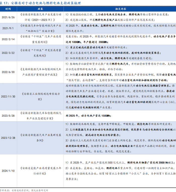 安徽省积极推动动力电池和燃料电池产业发展,发布多项政策确立产业目标和支持措施。自2021年6月安徽省发布《安徽省新能源汽车产业发展行动计划(2021—2023年)》以来,安徽省对动力电池与燃料电池的支持力度不断加大。