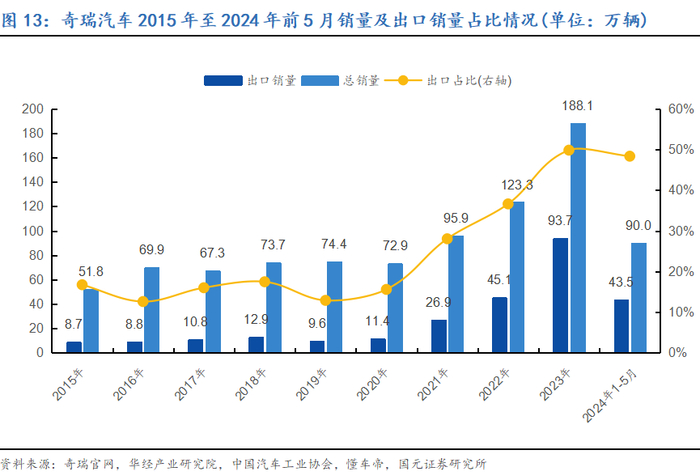 走上去(2020年-至今):从2020年起,奇瑞进入海外高速扩张期,并开始加速新能源转型,其出口量从2021年的26.9万辆激增至2023年的93.7万辆,增幅达到248%。出口在奇瑞总销量中的占比也显著提升,从2021年的28.0%上升至2023年的49.8%,使得奇瑞成为国内首个海外市场销量接近总销量一半的自主汽车品牌,并连续21年位居中国自主品牌乘用车出口第一。二十余年间,奇瑞织就了自己全球的经营网络,如今已建成10个海外生产基地,在海外拥有1500余家经销商,可以辐射全球80多个国家和地区,累计全球用户超过1300万。