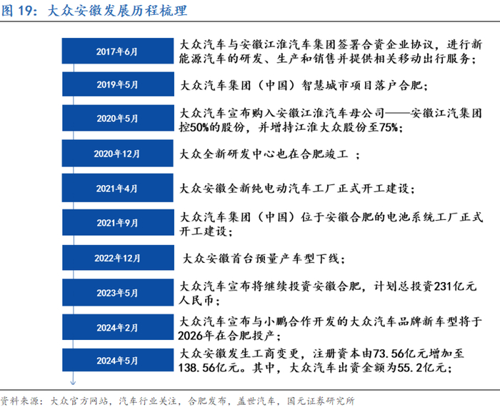 深度投资中国并反哺全球市场,大众安徽的另类合资发展路径。大众安徽起步于2017年,自成立之初便专注于新能源汽车的研发与生产。自我国于2018年从政策层面取消专用车、新能源车外资股比限制后,大众汽车宣布投资10亿欧元,获得江淮汽车母公司—安徽省江淮汽车集团控股有限公司50%的股份,同时增持电动汽车合资企业江淮大众股份至75%,获得合资公司管理权。在获得主导权后,大众安徽按下发展“加速键”:2021年4月大众安徽全新纯电动汽车工厂正式开工建设,并于仅仅20个月后下线了首款预量产车型;2023年4月,大众继续投资10亿欧元,推动全资子公司100%TechCo落户合肥;同年5月,大众安徽宣布计划追加231亿元总投资额;2024年5月,大众集团再次增资大众安徽48.75亿元。