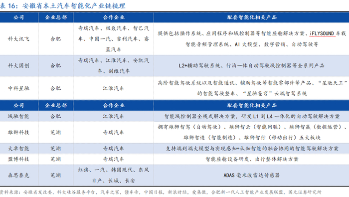 随着新能源汽车行业由电动化的上半场迈进智能化的下半场,核心产业链由电机电控为主,进入到以人工智能、半导体、算力、大模型、算法、声学、传感器以及视觉系统为重要支撑,以固态、钠离子、氢能源等先进电池技术为全新方向的阶段。安徽省多年自主培育+以投带引模式培育出的系列关联产业体系优势进一步体现。“科大硅谷”+合肥“中国声谷”+芜湖“中国视谷”及蚌埠“中国传感谷”联动赋能;百度阿波罗、大唐高鸿、星云互联、北科天绘、仓擎智能、宏景智驾、楚航电子等先后入驻;科大讯飞、科大国创、中科星驰、森思泰克、域驰智能、雄狮科技、大卓智能、盟博科技等本土企业茁壮成长。在政策、产业与资本、科创多重资源的共同推动下,面向未来,安徽省作为当前国内新能源汽车领先者,将更进一步,迈向全球智能电动产业新高地。