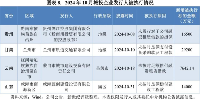 2024年10月,债券市场共有4家城投企业披露被执行情况,分别分布于贵州省黔南州、甘肃省兰州市、云南省蒙自市、山东省威海市等地区,涉及到的被执行标的余额共6.73亿元。从被执行原因来看,10月城投企业被执行仍以未能按时偿还融资租赁借款或委托贷款、未能履行对子公司的担保义务、未能支付项目工程款等为主。其中,威海蓝创建设投资有限公司(简称“威海蓝创建投”)因未按时足额偿付建设工程款于2024年10月11日被纳入被执行人名单,随后由于公司与债权人山东水总有限公司达成和解,威海蓝创建投于2024年10月16日被移出执行名单。