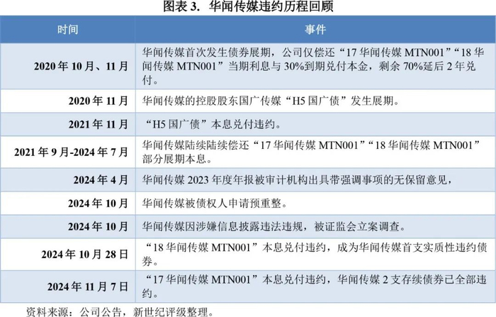 华闻传媒前身成立于1993年,公司股票于1997年在深交所上市发行。公司经过多次业务变动和股权变更,2012年国广环球传媒控股有限公司(简称“国广控股”)成为公司控股股东。从治理情况来看,华闻传媒股权结构分散,股权稳定性很弱,公司治理存在很大瑕疵。从经营情况来看,华闻传媒主营业务以报刊经营、印刷等传统媒体为主,面对行业环境变化未能成功实现转型。国广控股入股后,华闻传媒频繁的外部收购拓展业务板块,但最终由于业绩不佳计提大笔商誉减值,2018年公司归母净利润大幅亏损49.91亿元,此后经营业绩一直呈现低迷态势。2020年10月、11月,华闻传媒两支存续中期票据分别发生展期。2021年11月,国广控股发生债券实质性违约。2024年10月,在“18华闻传媒MTN001”违约前,华闻传媒被债权人申请预重整,法院已指定临时管理人,同时公司还因涉嫌信息披露违法违规,受到证监会立案调查。