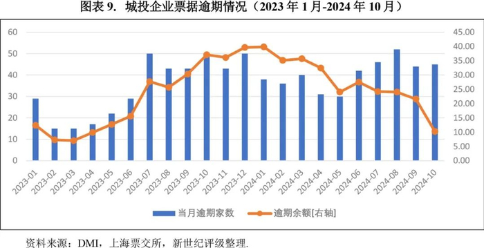 2024年10月,4家城投企业披露被执行情况,涉及到的被执行标的余额共6.73亿元,其中一家由于达成和解,已于当月移出被执行名单;45家城投企业发生票据逾期,涉及票据余额共10.27亿元,金额环比降幅较大。