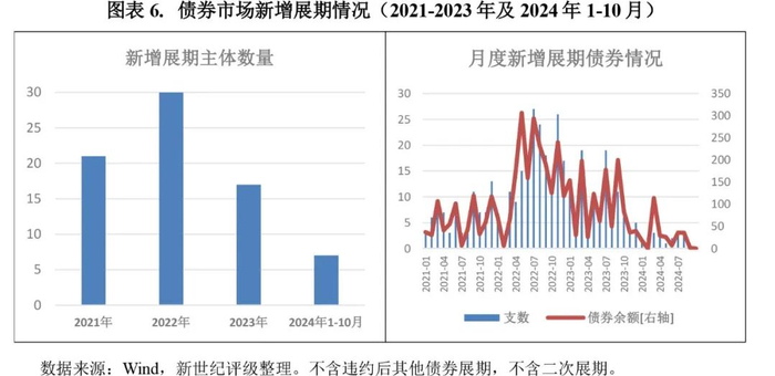 2024年10月,债券市场3支债券展期,分别为“H19景瑞1”、“18俊发01”和“H鹏博债”,均为前期已发生违约的债券,自2024年2月以来再次单月无新增展期债券。从累计情况来看,2024年1-10月债券市场首次展期债券共21支,首次展期时的本金余额共218.05亿元,较上年同期分别下降69支、801.39亿元;新增展期主体共7家,较上年同期减少10家。