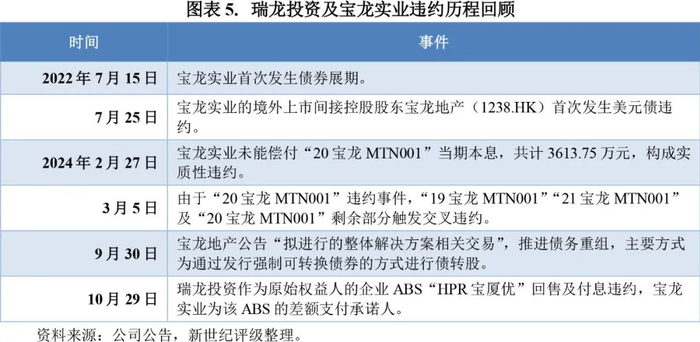 “宝厦一期2020-1”于2020年11月上市发行,发行规模共15.03亿元(其中优先级15亿元),按季度付息,本金固定摊还。从主体来看,“宝厦一期2020-1”的原始权益人瑞龙投资为首次违约。瑞龙投资为上海宝龙实业发展(集团)有限公司(简称“宝龙实业”)的子公司,宝龙实业对“宝厦一期2020-1”提供差额支付承诺。宝龙实业于2022年2月发生债券展期,2024年2月发展为实质性违约,其境外控股股东宝龙地产控股有限公司(简称“宝龙地产”,1238.HK)发行的境外债券也于2022年7月发生违约。