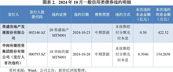 在一般信用类债券方面,2024年10月债券市场两支债券违约,分别为荣盛房地产发展股份有限公司(简称“荣盛发展”)发行的“20荣盛地产MTN001”与华闻传媒发行的“18华闻传媒MTN001”。具体来看,“20荣盛地产MTN001”曾于2023年达成展期,展期条款约定分期偿还,但2024年3月以来荣盛发展均无法完成分期本息的偿付,构成实质性违约;“18华闻传媒MTN001”于2020年11月首次展期,此后华闻传媒曾一度偿还部分债券本金并达成二次展期,但本月仍发生违约。截至违约前,“18华闻传媒MTN001”存续本金余额2.74亿元,此次违约的分期兑付本息共0.408亿元。