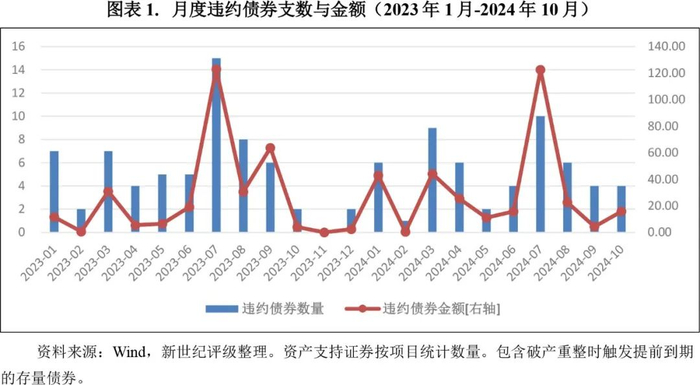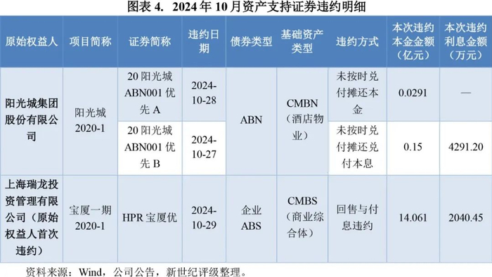 2024年10月,债券市场共有2期资产支持证券发生违约,分别为资产支持票据“阳光城2020-1”的2笔优先级“20阳光城ABN001优先A”、“20阳光城ABN001优先B”和企业ABS“宝厦一期2020-1”的优先级“HPR宝厦优”。从违约方式来看,“HPR宝厦优”为回售与付息违约,违约金额共14.27亿元(其中违约本金14.061亿元);“阳光城2020-1”为摊还本息违约,本次违约金额共0.61亿元(其中违约本金0.18亿元),规模相对较小。