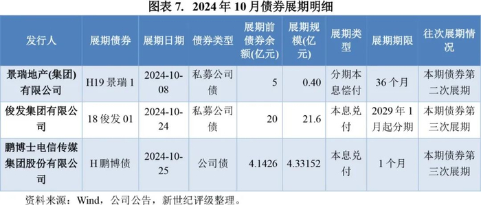 从主体来看,2024年10月展期债券分别涉及景瑞地产(集团)有限公司(简称“景瑞地产”)、俊发集团有限公司(简称“俊发集团”)和鹏博士电信传媒集团股份有限公司(简称“鹏博士”)等3家发行人。累计情况来看,2024年1-10月债券市场新增展期主体共7家,较上年同期减少10家。