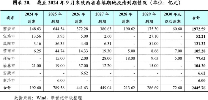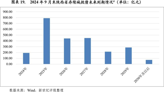 从存续城投债的到期时间来看,陕西省城投债到期需偿还债务额主要分布在2024-2029年,其中2025-2027年城投债到期规模大,存在较大的偿付压力,分别需偿付789.58亿元、441.63亿元和449.04亿元。