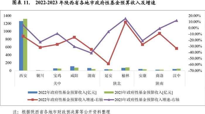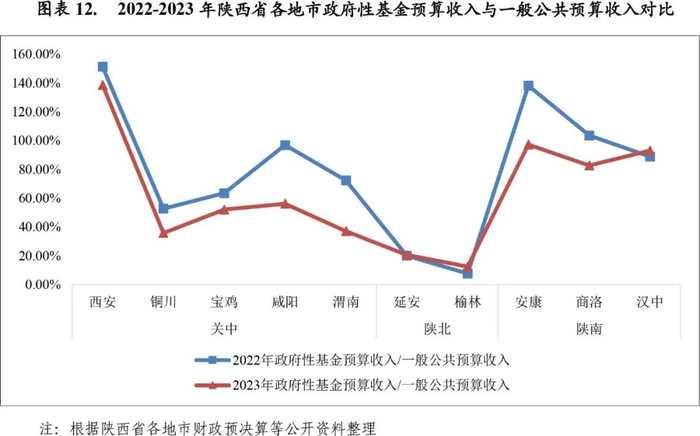 陕西省下辖各地市政府性基金预算收入规模差异较大,2023年西安政府性基金预算收入规模仍独占鳌头,其余地市政府性基金预算收入规模有限。从增速来看,由于房地产行业景气度不佳使得土地出让市场受挫,仅榆林、汉中和西安三市政府性基金预算收入实现正增长。从政府性基金预算收入与一般公共预算收入规模比较来看,大部分地市该比例较上年有所下滑,当年西安、安康、汉中和商洛该比例超过82%,政府性基金预算收入对地方财力的贡献度较大,榆林市该比率仅为12.57%,地方财力对政府性基金预算收入的依赖度最低,其余地市分化明显。