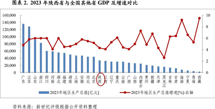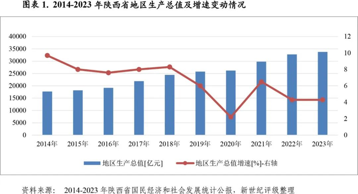 陕西省位于中国西北内陆,是全国重要的重工业基地,能源化工、装备制造和有色冶金等传统产业较为发达,经济总量在全国各省中处于中游水平。2023年陕西省实现生产总值3.38万亿元,全国各省(区、市)排名第14位,但在复杂严峻的内外部环境下,经济增长压力加大,当年经济增速低于全国水平。从经济增长动力结构看,2023年陕西省民间投资活力不足,房地产开发投资持续回落,使得固定资产投资增速下滑明显,同时进出口需求不振,主要依靠消费市场带动经济增长。2024年上半年度,陕西省实现地区生产总值1.63万亿元,同比增长4.3%。