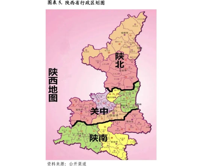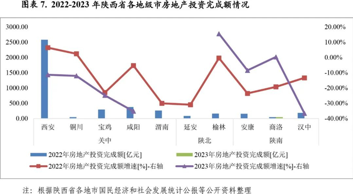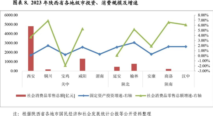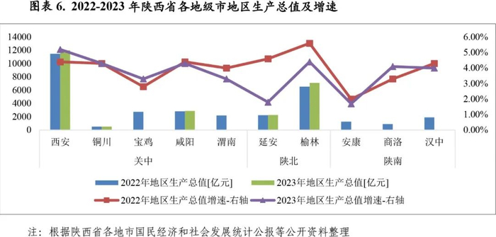 陕西省经济发达城市主要集中于关中地区,为国家重要的装备制造业基地,系全省经济的中坚力量,经济体量约占全省六成以上。经国务院批复通过,该区域与天水、商洛、杨凌、庆阳、平凉、陇南等城市组成关中-天水经济区,以大西安(含咸阳)为中心城市,宝鸡为副中心城市,依托陇海铁路(欧亚大陆桥)和连霍高速公路,形成中国西部发达的城市群和产业集聚带。西安都市圈包括西安市全域(含西咸新区)、咸阳市、铜川市、渭南市部分县(区)和杨凌农业高新技术产业示范区,旨在发挥西安辐射带动周边城镇联动发展作用,加快西安-咸阳一体化发展,积极推动基础设施互联互通、产业分工协同协作、公共服务共建共享、生态环境共保共治,建立健全同城化协调发展机制和成本共担利益共享机制,积极培育现代化都市圈,提升对关中平原城市群的支撑能力,更好助推新时代推进西部大开发形成新格局,更好服务黄河流域生态保护和高质量发展,更好融入共建“一带一路”。西安市是国家重要的科研、教育和工业基地,我国西部地区重要的中心城市和交通枢纽,世界历史文化名城,目前已形成高新技术产业、装备制造业、旅游产业、现代服务业、文化产业五大支柱产业。2023年西安完成地区生产总值1.20万亿元,同比增长5.2%,增速居全省首位,当年三次产业结构为2.71:34.53:62.77,在全省经济规模中处于绝对领先地位。咸阳市与西安市一体化发展水平较好,是西北最大电子工业基地,已形成电子显示、高端能化、装备制造、食品加工、现代服务业五大主导产业。2023年咸阳完成地区生产总值2878.26亿元,增速为4.3%。此外,宝鸡和渭南经济体量也在2000亿元以上,当年增速均为3.3%。铜川市经济体量居全省末位,2023年地区生产总值仅为510.63亿元,增速4.3%。陕北区域的榆林、延安两市为典型的资源型城市,且以煤炭采选和石油、天然气开采为支柱产业,2023年分别完成地区生产总值7091.44亿元和2280.24亿元,增速分别位4.4%和1.8%,其中榆林市地区生产总值居陕西省第二位。陕南地区以生物产业、新材料产业和节能环保产业为主导产业,但经济规模总体不大,仅高于铜川市。其中汉中市在陕南地区经济规模居首位,工业以有色金属、能源化工、装备制造和食品工业为主,商洛市新型材料产业增加值占比较大,安康市工业则以新型材料和富硒食品为主,2023年上述三市地区生产总值增速分别为4.0%、4.1%和1.7%。从经济增速来看,2023年陕西省实现正增长的地市包括西安、商洛和宝鸡,经济增速同比分别增长0.8%、0.8%和0.5%;铜川市经济增速与上年持平,其余地市均有不同程度下滑,其中延安市经济下行压力最大,当年降幅达-2.8%。