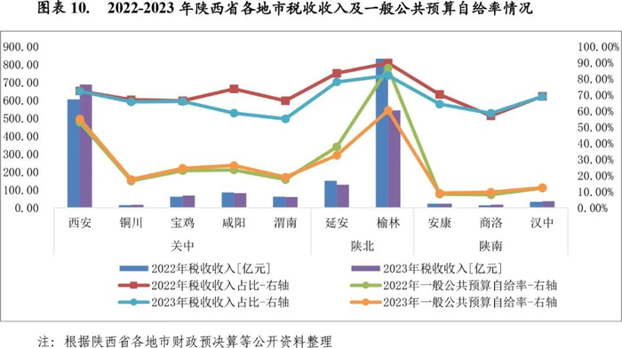 由于经济发展水平各异,陕西省各地市一般公共预算收入差距较大,西安和榆林两市一般公共预算收入规模大幅领先于其他地市,占全省各市一般公共预算收入合计数(剔除省本级)的比重合计为71.1%。从收入构成看,榆林和延安因为煤炭资源税贡献较大,财政收入质量最高,2023年税收收入占一般公共预算收入的比重分别为82.0%和78.0%;从一般公共预算自给率看,除榆林和西安该比率在55%以上外,其余各地市一般公共预算收支平衡能力总体处于较低水平,对上级补助收入的依赖性较高。
