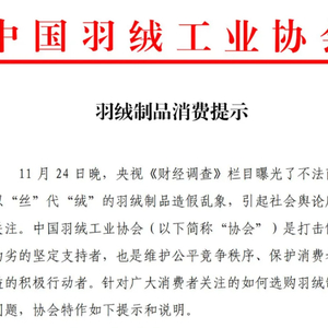 为打击假冒伪劣,维护公平竞争秩序、保护消费者利益,中国羽绒工业协会于11月26日发布“羽绒制品消费提示”,明确羽绒制品选购方法要点: