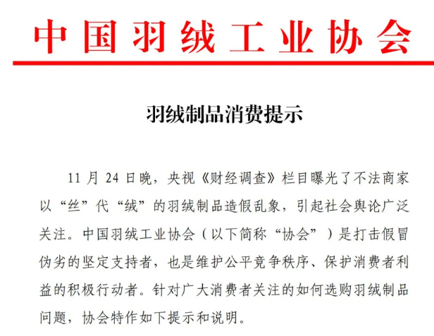 权威提示!事关羽绒制品消费