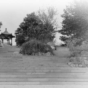 这个景区的路边有一块瓦屋造型的展板,上面的文字与那位工作人员的说法一致。展板的旁边是金台古井,多边形灰色井栏上雕有古意盎然的花纹。古井刚好位于高台的入口处,从那里拾级而上,便可抵达仿造的幽州台。那一段坡路的石阶跨度不大,却很密集,走起来一路碎步,显得姿态虔诚。高台的地面以不规则石块铺砌,函远亭与苍松兀立于乱石之上。四周竖立若干诗碑,上面的刻字除了陈子昂的《登幽州台歌》,还有李白等其他唐朝诗人的名诗。