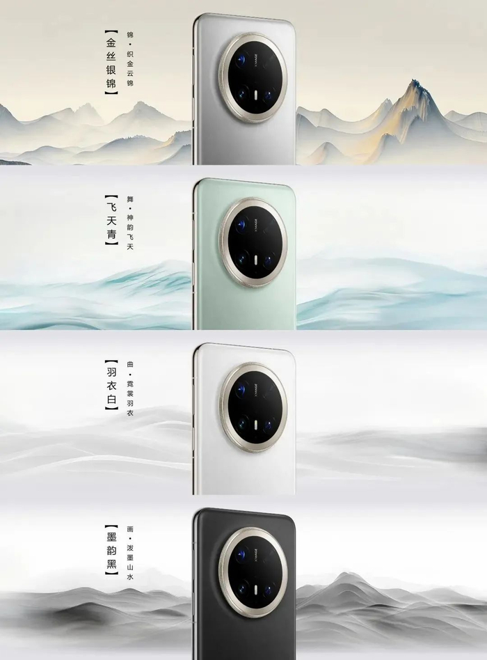 据华为官方介绍,华为Mate70系列持续引领科技美学,Mate70 Pro+推出东方锦色的色彩理念,带来金丝银锦、飞天青、羽衣白、墨韵黑四种色彩选择,灵感分别源自丝绸云锦、飞天舞蹈、唐代《霓裳羽衣曲》、泼墨山水画,寓意着不同文化之间的共生交融。