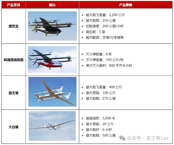 峰飞航空科技的产品主要包括大型eVTOL载物航空器和载人航空器。eVTOL航空器采用峰飞自主研发且获得发明专利的复合翼构型,将垂直起降能力与高速前向飞行的能力相结合,既可以像直升机一样垂直起飞和降落,也可以如固定翼大飞机一样高速巡航。主要产品情况如下: