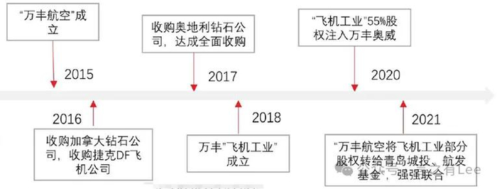 万丰奥威成立之初主要从事汽车零部件的生产销售业务,2010年,公司开始讨论从汽车零部件行业走向大交通领域。通过多次召开董事会和组织专班团队开展专题讨论,在全球范围考察调研,又邀请行业专家进行论证,2014年,万丰正式敲定切入航空赛道。其后的发展历程如下所示: