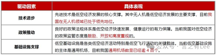 低空经济驱动因素主要包括政策推动、技术进步以及基础设施支撑。