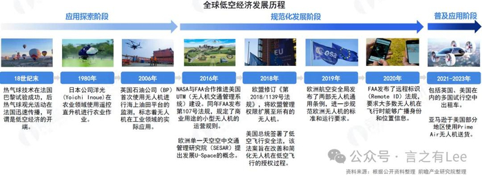 全球低空经济发展至今先后经历了早期应用探索阶段和规范化发展阶段。在早期,由于低空技术不成熟,低空产业主要以农业、工业的探索应用为主。2010年以后,随着低空飞行技术的愈发成熟和应用的多元化,规范化监管成为这一时期各国低空经济发展的主要任务。当下全球低空经济正处于进一步的应用普及阶段。