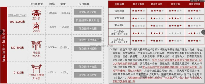 低空飞行主要应用场景包括物流、文旅、载人、公共服务(救援、消防、医疗)和生产作业(农业、巡查、监查)等,其中物流和农业主要以无人机为主,技术已较为成熟。