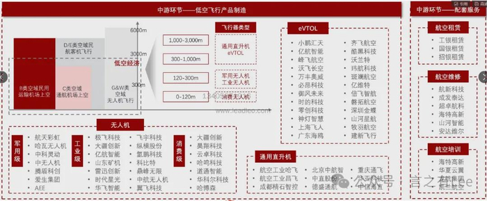 产业链中游主要包括低空飞行装备制造与配套服务。制造端作为产业链核心环节,占据全产业链价值50%以上,主要包括直升机、eVTOL和无人机。