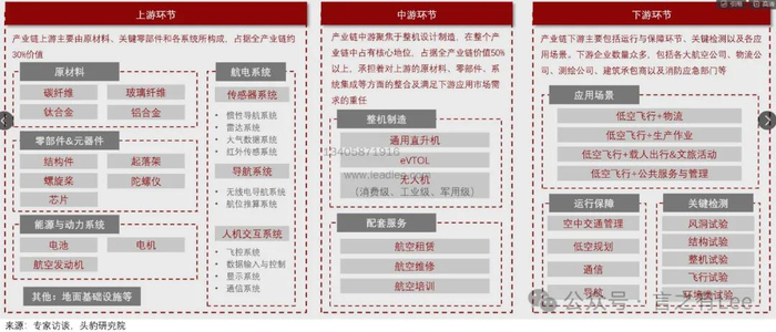 低空经济下游主要包括运行与保障环节、关键检测环节以及应用领域。