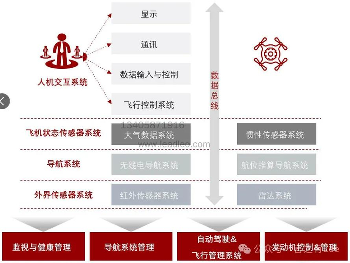 航空电子系统是飞机上所有电子设备的总和,是飞行器的中枢神经系统,主要分为传感器系统(惯性导航系统、大气数据计算机、雷达、红外传感等)、导航系统(无线电导航、航位推算导航等)、以及人机交互系统等。其主要功能包括飞行控制、通信、导航、监视、显示等。航电系统的设计水平直接影响飞行器的安全性和可靠性,同时也影响飞行器的经济性和舒适性。