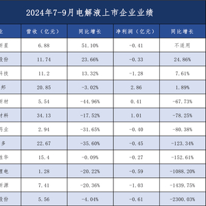 近日,多家电解液产业链上市企业发布2024年前三季度业绩,广东省电池行业协会对12家电解液产业链上市企业的业绩进行了统计与梳理。