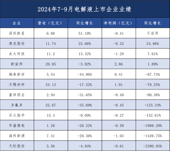 2024年前三季度,12家电解液产业链企业的营收总额达到406.86亿元,净利润合计为3.06亿元(含亏损额度在内)。