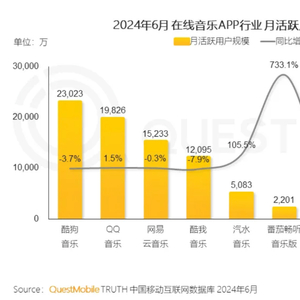 从APP流量来看,腾讯系音乐平台优势也很明显。QuestMobile数据显示,在2024年6月,腾讯系酷狗音乐、QQ音乐月活分别达到2.3亿、1.98亿,网易云音乐仅为1.52亿。