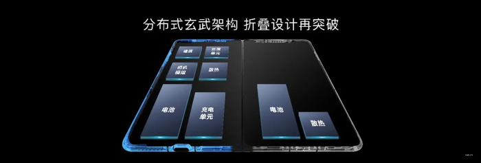 在过去,许多“跟风而行”的折叠屏产品,都有个绕不过的“槽点”——虽然表面看来是折叠手机,但本质上不过是直板机架构的延续,主要器件仍“蜗居”在主框,副框空间未能有效利用。在这一方面,华为首创的分布式玄武架构,对折叠机主框和副框的零部件全新布局设计,极大程度增加了整机器件的空间,让机身更轻更薄的同时,为天线、散热等元器件提供了更充裕的空间。