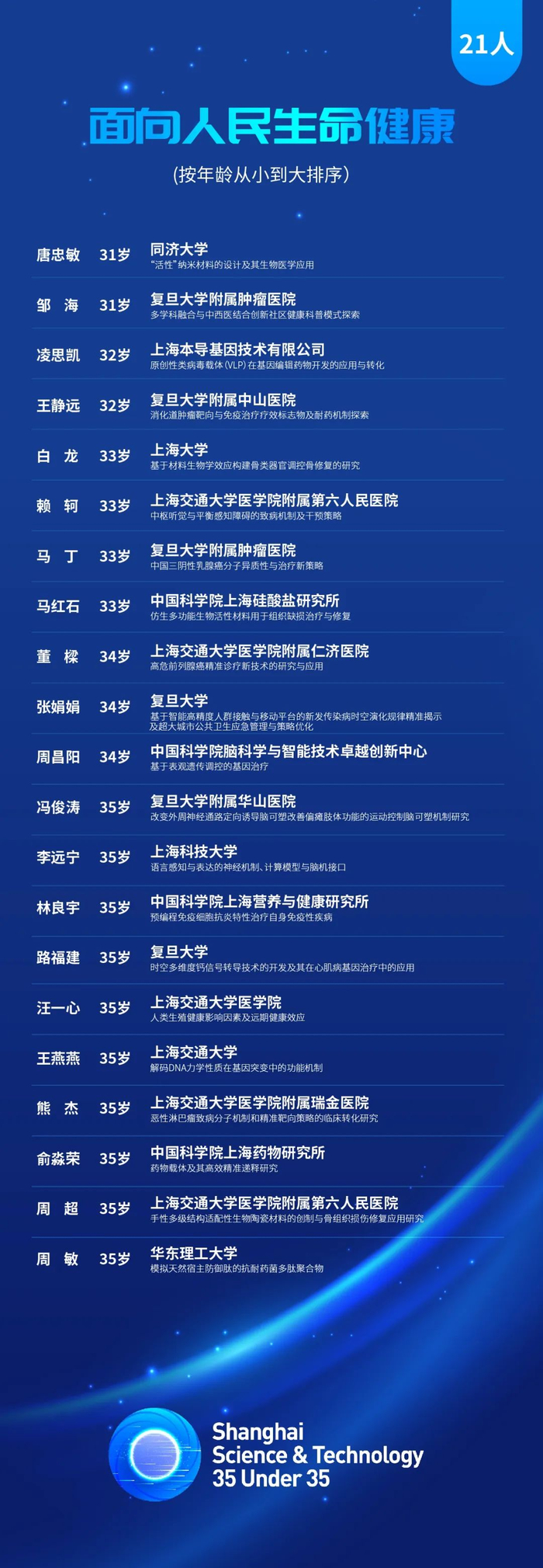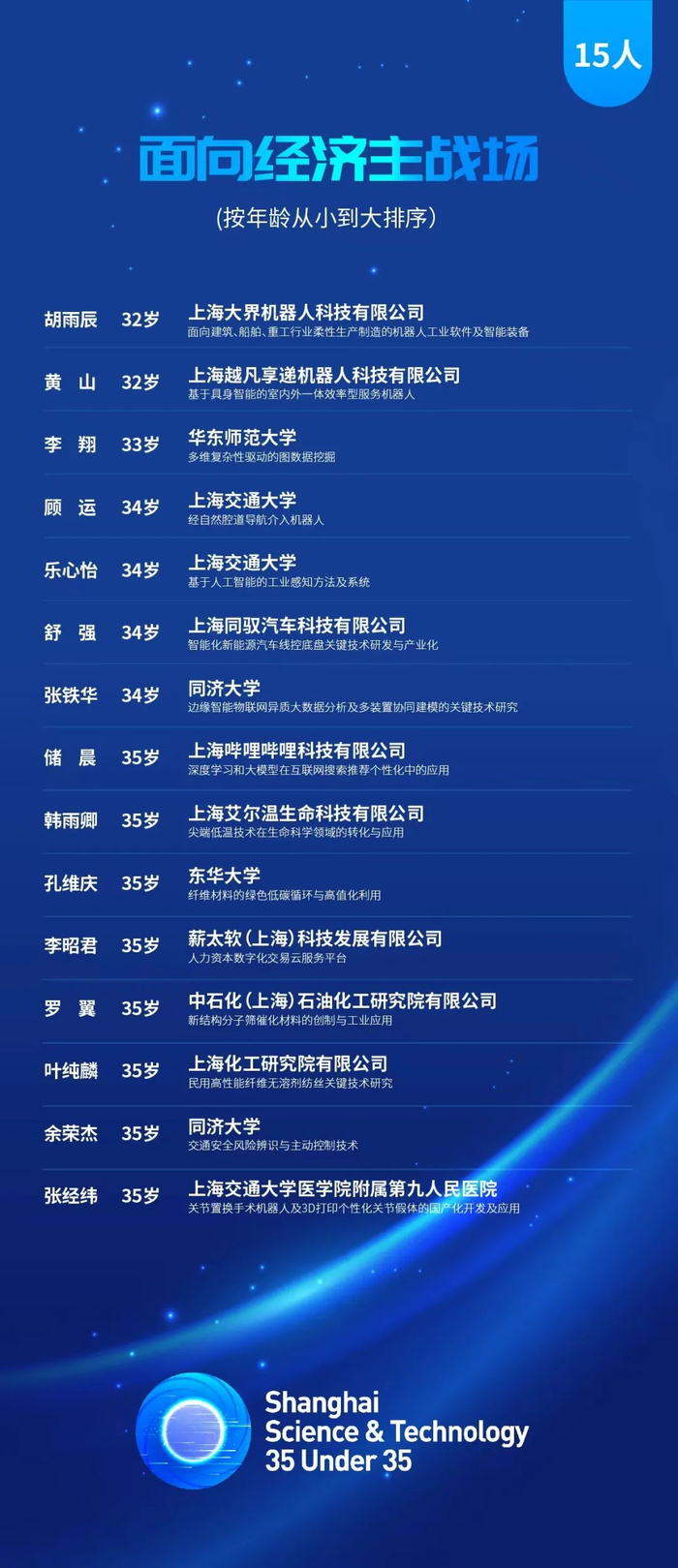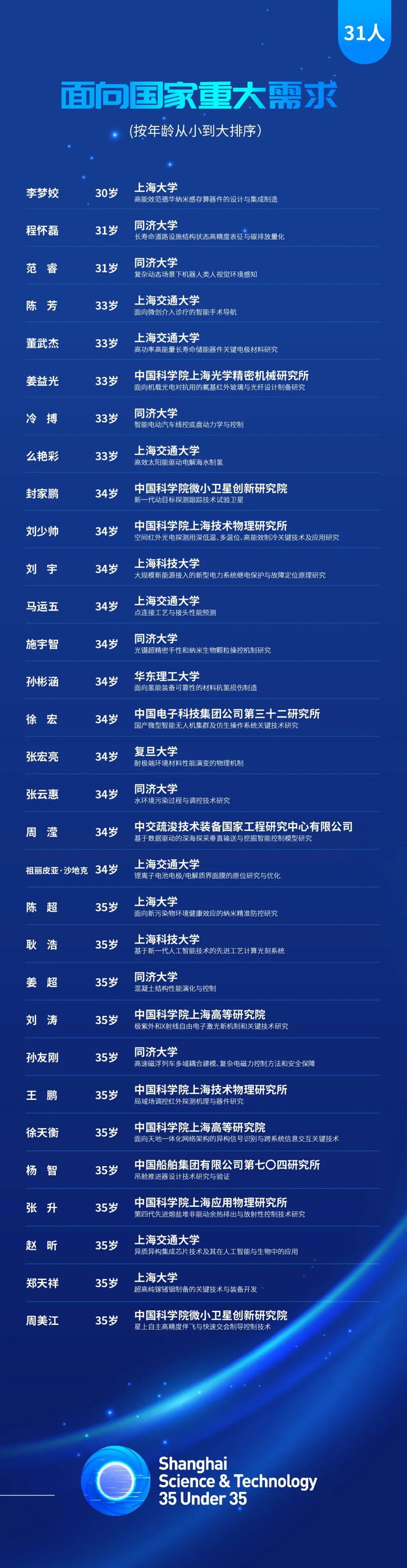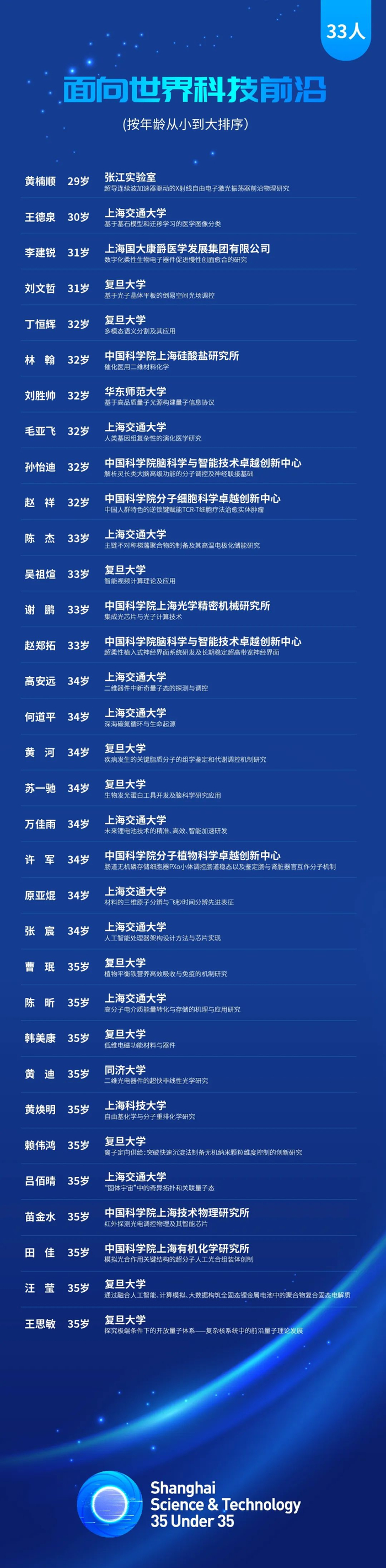 市科技工作党委介绍,2024年上海科技青年35人引领计划(以下简称“上海科技35U35”)初评工作已经结束。上海科技青年35人引领计划,从世界科技前沿、经济主战场、国家重大需求、人民生命健康等战略方向,选拔35名获奖者和15名提名者,旨在探索更有利于青年科技人才脱颖而出的评价和选拔机制,培养和造就一批具有全球视野和创新影响力的青年科技工作者。现将入围终评的100名上海科技35U35候选对象,于今日至12月5日进行公示,名单详见↓