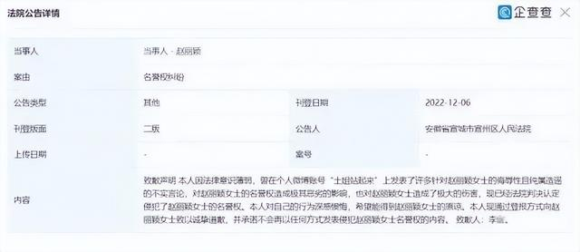 2022年12月,李某刊登道歉声明,声明中称其曾在个人微博账号上发表许多针对赵丽颖的侮辱性且纯属造谣的不实言论,对赵丽颖名誉权造成极其恶劣的影响,其对自己的行为深感懊悔,现通过登报方式向赵丽颖致以诚挚道歉,并承诺不会再以任何方式发表侵犯赵丽颖名誉权的内容。
