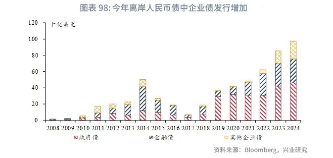 一级市场方面,中资美元债发行量偏弱,主要受地产发行大幅下降的拖累。而离岸人民币债发行量持续上升,主要来自中国政府、金融部门与企业。2024年,中资美元债和离岸人民币债两者发行规模几乎持平。海外机构发行的离岸人民币债占比仍较小,熟悉度以及市场配套机制仍待完善或是外资进入离岸人民币市场的最大阻碍,但人民币国际化的进行、较美元更低的离岸人民币债融资成本以及南向通等因素将助力明年离岸人民币债的发行。化债和隐性债务清零表明未来监管可能将强化对城投海外发债的约束,因此城投海外发债量明年或有所降温。