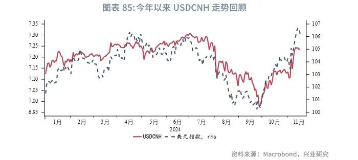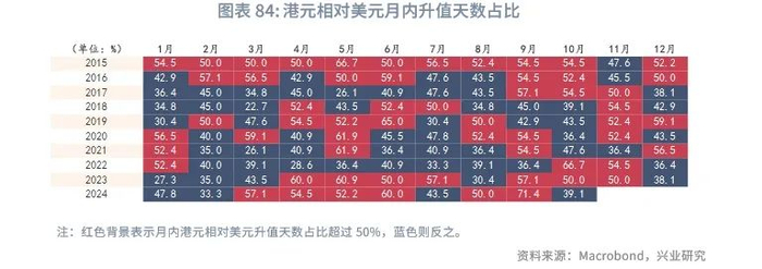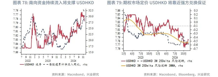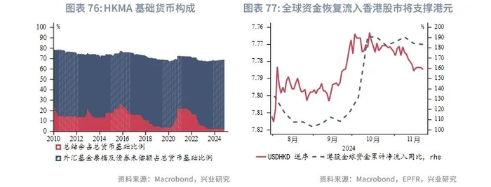 今年第一季度港元受美元升值影响靠近弱方兑换保证,而第二和第三季度随着美联储降息预期增强,美元震荡下行,港元逐步靠近强方兑换保证,而9月开始的“特朗普交易”和美国经济的韧性推动美元反弹至近两年高位,港元小幅贬值。