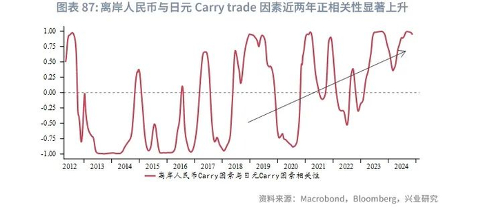 根据我们过往对澳元的研究,我们首次构建了基于Carry trade、趋势因素、价值因素的三因子模型[4],同样可以应用于研究人民币,可以看到近期融资货币属性主导了人民币汇率的波动,人民币与日元的Carry trade因素近两年来正相关性显著上升,说明日元正在逐渐成为人民币汇率的新“锚”。
