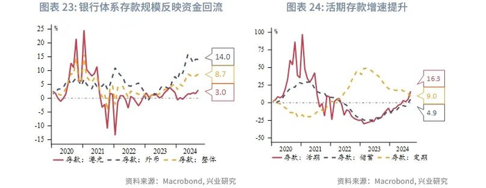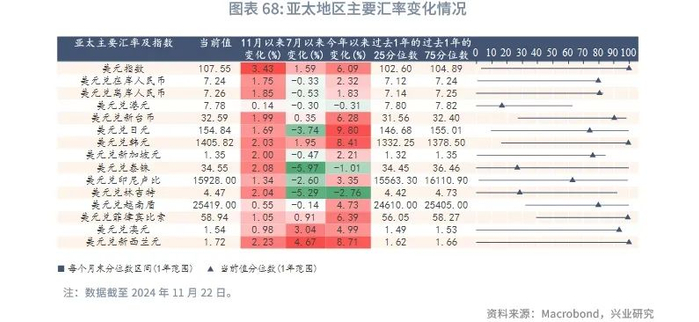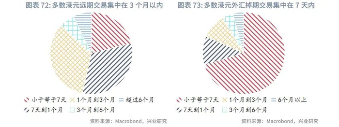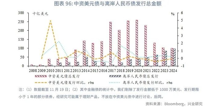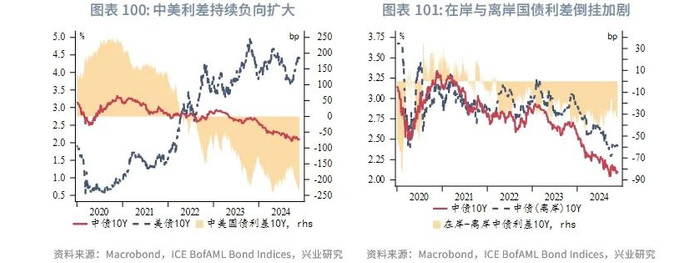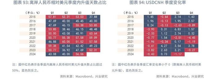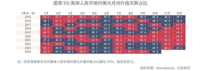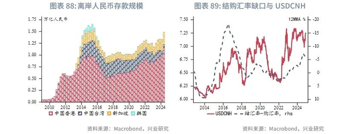 展望2025年,离岸人民币或将跟随在岸人民币上半年升值,特别是第一季度结汇较为活跃,但下半年有所回调。如果美国对中国商品加征关税,离岸人民币面临更大的贬值压力。根据兴业研究外汇商品部对在岸人民币的研究[5],上半年人民币在“特朗普交易”告一段落后有望重新获得升值动力,创造购汇锁定窗口,下半年需关注美国可能进入第三库存周期需求上行期,套息交易重构造成日元和人民币走弱,以及中美关税冲突导致的人民币承压(时间不定,偏脉冲式影响)。逆周期调控相机抉择,双向调控汇率预期。