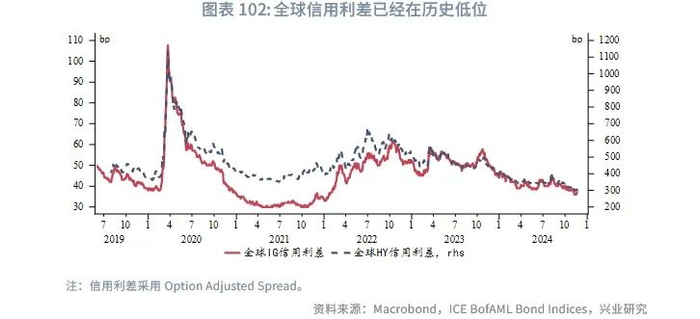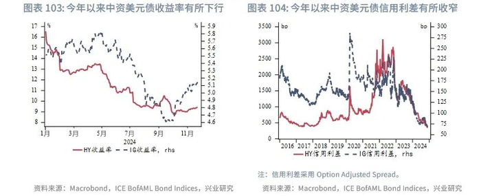 债市方面,今年中资美元债与离岸人民币债发行规模几乎持平,人民币国际化的进行、相对美元更低的融资成本等因素将继续助力明年离岸人民币债的发行。展望2025年,当前信用利差已经在历史低位,而全球经济仍面临关税、降通胀受阻、利率仍较高等诸多不确定性,预计未来中资美元债信用利差收窄空间有限,可能仍以低位震荡为主。离岸人民币债信用利差表现可能会有分化,特别是城投板块。伴随着隐性债务逐步“清零”,城投公司信用将逐步与地方政府脱钩,城投公司的经营状况将大体决定其融资成本。