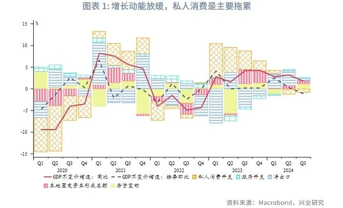 2024年香港经济增长动能逐步放缓。第三季度GDP环比意外收缩1.1%,同比增速从之前的3.2%放缓至 1.8%。私人消费是主要拖累,从第二季度开始,连续两个季度小幅萎缩。固定投资温和扩张,但第三季度同比增速放缓至 3.7%。政府支出增速相对稳定。外需是拉动香港经济的主要动能,但第三季度的贡献也稍有下滑,与近期出口增速放缓一致。