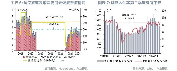 受多重结构因素影响,香港本地消费疲弱,这是拖累其经济增长的主要因素。今年前10个月,月度来港访客人数2024年仍仅恢复至疫情前2017-2019年月平均水平的74%,其中内地游客和海外游客均低于疫情前水平。同时,总体访港旅客的消费力明显下滑。虽然酒店入住率已经基本恢复至2018年水平,但酒店平均房租在过去数月持续下滑,显示旅游需求较弱,酒店或以降价来维持入住率。内地访客是旅游消费的主力军。2024上半年内地访港旅客的人均消费降至1588港元,对比疫情前2018年上半年的3190元,大幅下降约50%。这表明内地旅客消费习惯的改变,从 “爆卖”转为追求以文化体验为主的“深度游”。同时,由于内地消费品种丰富多样,价优服务好,叠加疫情以来港经济和收入不振等因素,香港本地居民兴起“北上”的新消费模式。持续下跌的香港楼市和波动巨大的港股通过负财富效应抑制居民的消费意愿。以上因素综合起来导致本地消费从年初以来持续下滑。