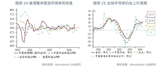 展望明年,预计外部需求保持韧性。美国经济仍呈现较强韧性,主要央行的持续降息也将缓解利率的限制性,并维持相对宽松的金融条件。10月标普全球香港PMI升至52.2,创1年半以来新高,反映香港整体经济环境有所好转。受益于中国内地与海外需求提升,新增订单增幅创一年半新高,企业提高采购并扩充库存,悲观情绪有所减弱,这些积极迹象都表明短期内出口动能仍将持续。同时,结构性扩张的半导体相关行业仍将促进香港转口贸易发展。